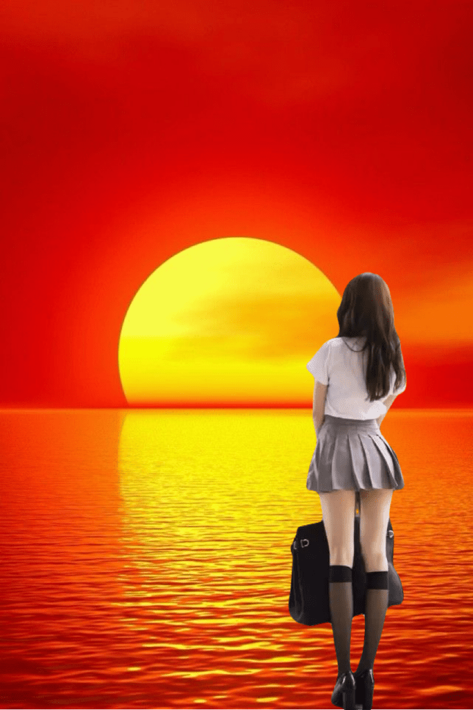 この画像は、水辺に立って遠くを見つめる人物が描かれています。大きく、鮮やかな色彩の夕日が水平線に到達しており、空は上部で深い赤から、太陽が水と交わる部分で明るい黄色に遷移しています。水面は穏やかであり、夕日のグラデーションを反映し、その表面にきらめきを生み出しています。人物は後ろ姿で、白いトップス、プリーツスカート、ニーハイソックス、黒い靴を履いており、右側に黒いバッグを持っています。画像は、暖かな夕日の色調が際立ち、考え深く静かな雰囲気を醸し出しています。
