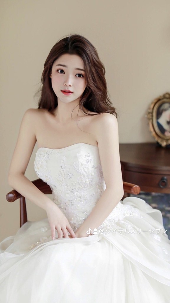 彼女は肩を出した白いウエディングドレスを着用しています。ドレスのボディスは複雑な白いレースやビーズが施されており、目を引くディテールと質感を醸し出しています。ドレスのボディスはしっかりとしたボニングが施されており、下部は見えませんが、ボリュームのある、多層に見えるスカートを持ち、優雅で華やかな外観を演出しています。
