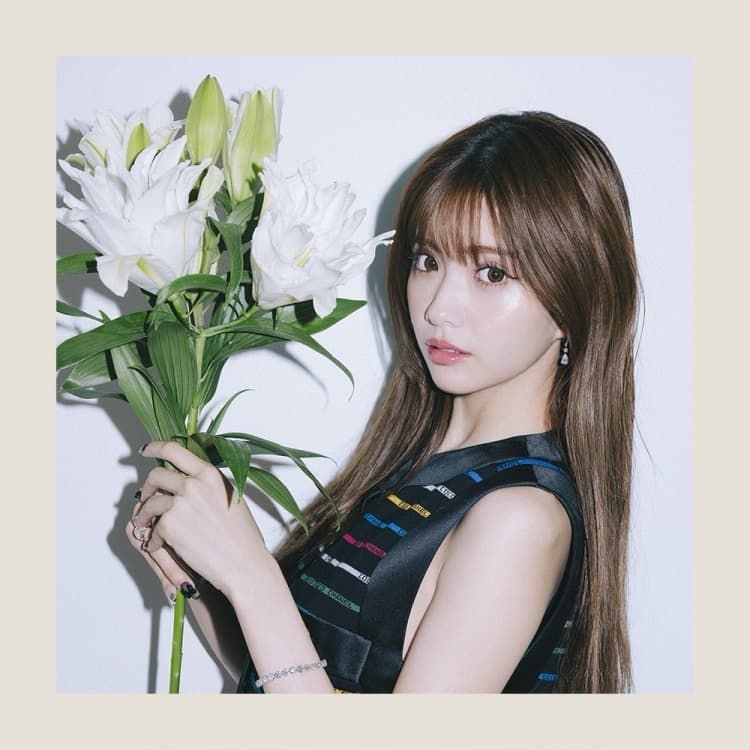 画像には、白いユリの束を持つ女性が写っています。彼女は穏やかな表情で、長い茶色の髪や繊細なメイクをしています。女性は色とりどりのストライプとテキストが入った袖のないトップスを着用し、ブレスレット、リング、イヤリングなどのアクセサリーを身に着けています。背景は単純で明るい色合いで、女性とユリの鮮やかな白を引き立てています。全体的な雰囲気は静かで穏やかであり、ユリは純潔と平和を象徴し、女性の穏やかな表情と調和しています。