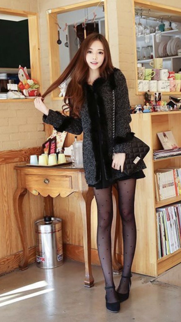 彼女は透明な黒いストッキングを履いており、先の尖ったベージュのハイヒールパンプスを履いています。彼女の爪は自然な見た目のポリッシュで整えられており、少なくとも片耳に大きなつり耳飾りを身に着けています。女性は左手で右手の手袋を外し、マッチングの手袋を身に着けていることがわかります。