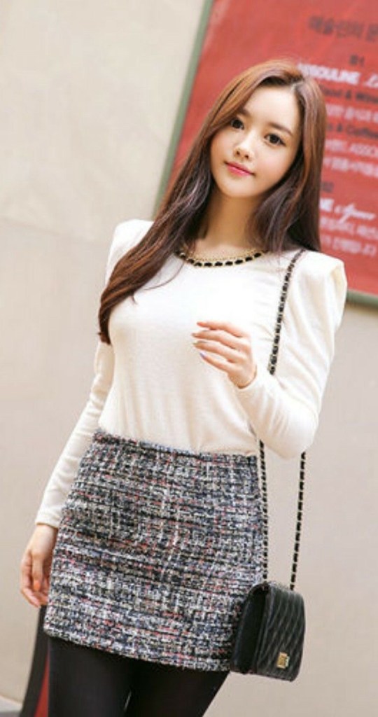 この画像は、灰色のソファの端に座っている女性の姿が描かれています。彼女は長い黒髪で、ややウェーブがかかったスタイルで、カメラの少し横を見ながら落ち着いた表情をしています。彼女の服装は、体にフィットした長袖の白いタートルネックトップと、ウエストラインに2つの装飾ボタンが付いたツイード風の短い白いスカートです。