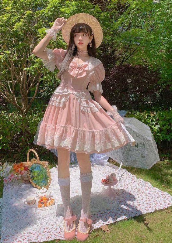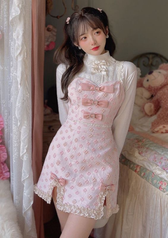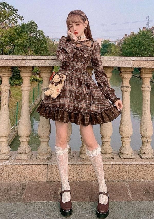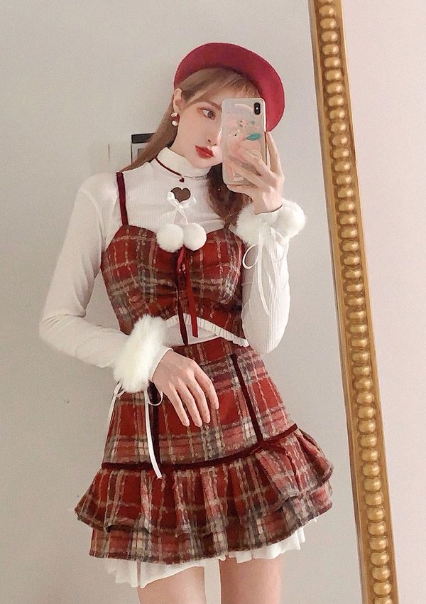 鏡の中の人物は、赤とベージュのチェック柄のドレスを着ています。ドレスには白いフリルのインナーレイヤーがあり、四角いネックラインと、前面に赤いリボンで繋がった2つのフワフワした白いポンポンが特徴です。ドレスの下には白いタートルネックの長袖トップを着用しており、袖口にはドレスとマッチするフワフワしたポンポンが付いています。